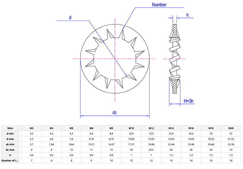ThePodkładka ząbkowana z zębami wewnętrznymima wewnątrz ząbkowany kształt, który zwiększa tarcie i ułatwia wzmocnienie. W przypadku wibracji spowodowanych siłami zewnętrznymi można go lepiej zablokować. Do wyboru jest wiele materiałów, a odpowiedni materiał można wybrać w zależności od środowiska użytkowania i konkretnych potrzeb.